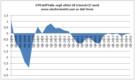 EconomiaIL PIL DELL’ITALIA NEGLI ULTIMI 28 TRIMESTRI (7 ANNI) Pubblicato 11 anni fail 2 Marzo 2015Di admin Share Tweet Post di Paolo Cardena’ di Vincitori e Vinti Quello che segue un grafico che rappresenta le variazioni trimestrali del PIL rispetto al trimestre precedente, utilizzando dati destagionalizzati forniti dall’OCSE. Si osserva che, negli ultimi 28 trimestri, ben 20 sono risultati negativi. Argomenti correlati: pubblicitàI più letti Difesa2 giorni faSvizzera sotto attacco (di droni): Berna corre ai ripari con un nuovo scudo Europa2 giorni faMerkel riscrive la storia: “Colpa di Polonia e Baltici se Putin ha invaso l’Ucraina” Cina3 giorni faUSA: il grande ritorno a Subic Bay. Una base logistica anti-Cina nelle Filippine Economia2 giorni faIl “Suicidio Industriale” europeo: Ineos chiude in Germania per costi energetici e “Ipocrisia ecologica” Economia2 giorni faQuando l’Intelligenza Artificiale diventa… avida stupidità: il clamoroso caso Deloitte in Australia pubblicità