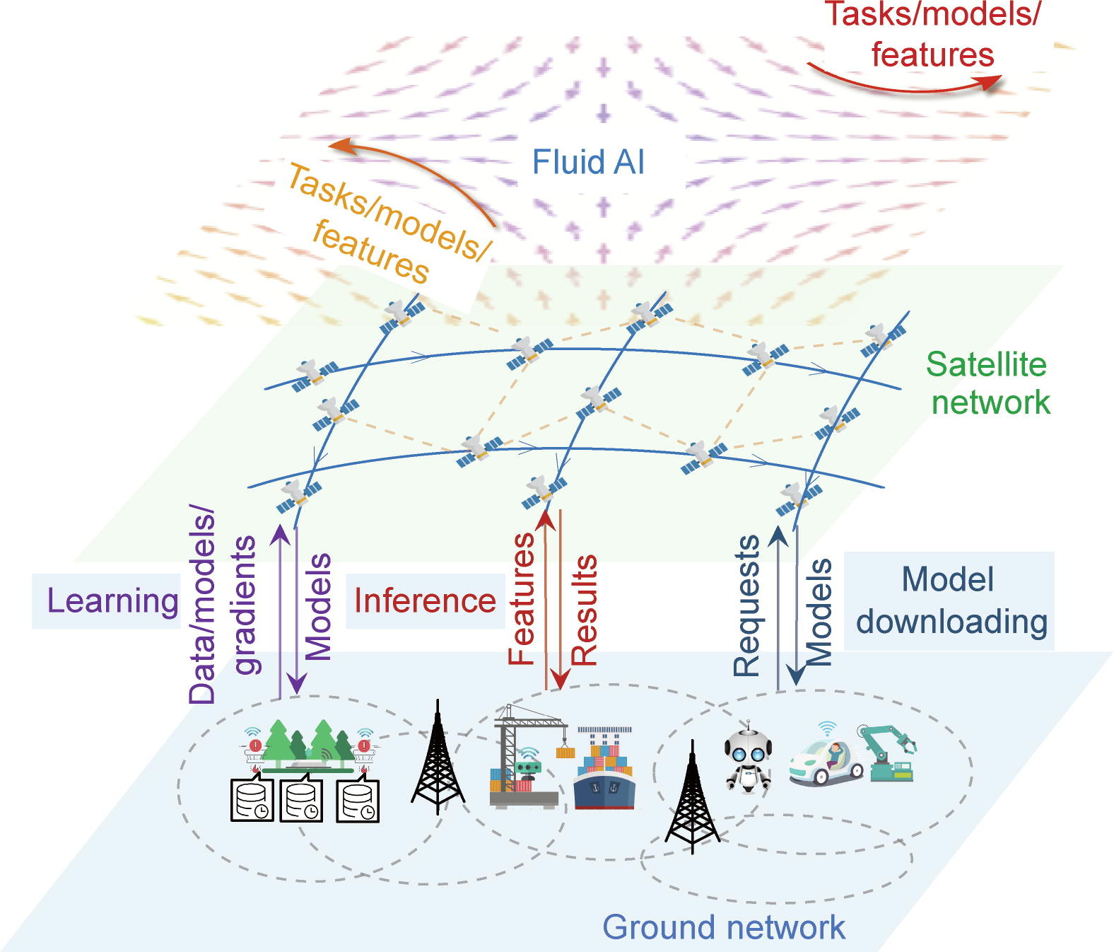 (3) Stazioni terrestri. Le stazioni terrestri si collegano ai satelliti tramite collegamenti feeder e fungono da centri di controllo del sistema di IA fluido. Poiché sono collegate ai data center tramite cavi ottici cablati, queste stazioni terrestri possono funzionare efficacemente come cloud. Sono responsabili del calcolo di strategie efficienti di gestione delle risorse e della direzione dei satelliti e dei dispositivi terrestri per l’esecuzione delle istruzioni. Inoltre, grazie alle loro potenti capacità di calcolo, le stazioni terrestri possono cooperare con i satelliti per fornire cloud-edge computing.