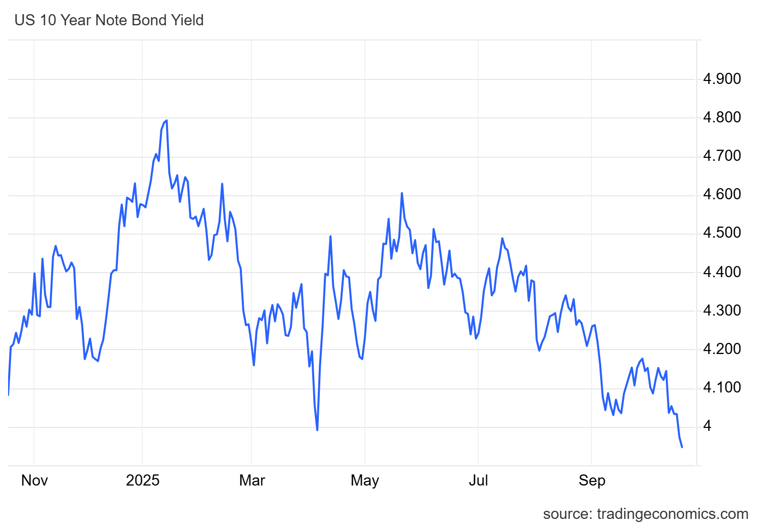 - Crollo dei rendimenti USA: Il tasso sul titolo decennale statunitense, il faro dei mercati globali, è crollato attorno al 3.95%, toccando il minimo da aprile. Traduzione per i non addetti: gli investitori comprano forsennatamente titoli di stato (sicuri), facendone salire il prezzo e, di conseguenza, scendere il rendimento. La fuga è innescata da nuovi timori sul mercato del credito, con crolli per le banche regionali Zions e Western Alliance (per prestiti “difficili”) e fallimenti di peso (come l’azienda di ricambi auto First Brands e il prestatore subprime Tricolor).