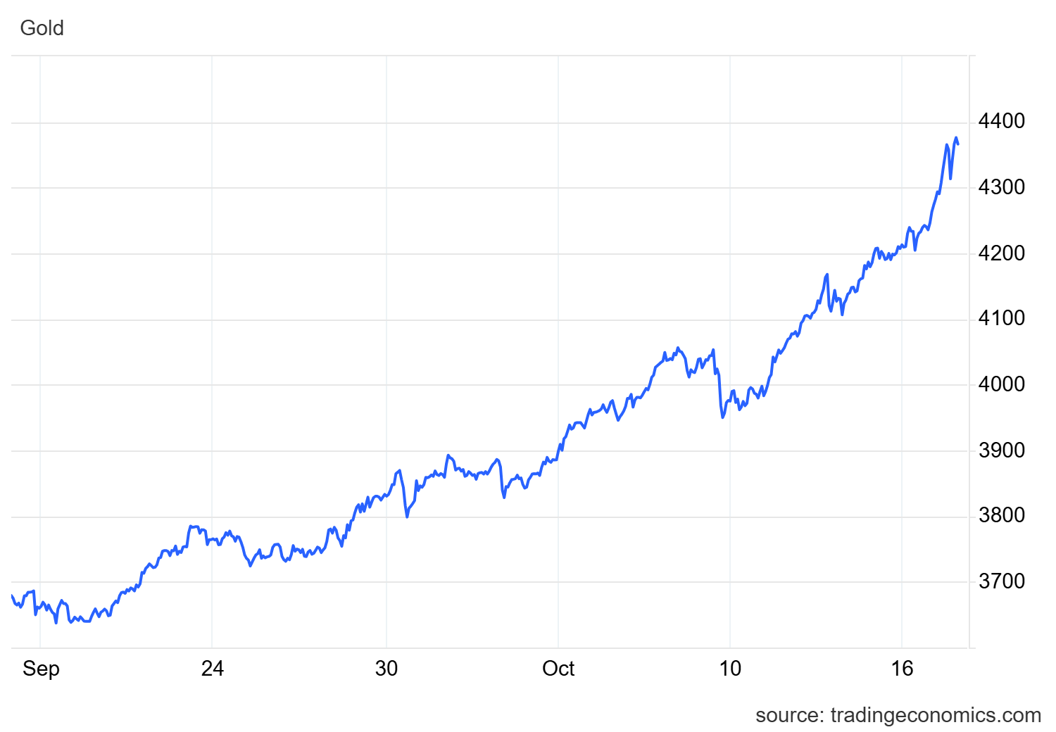 L’oro esplode: Come ormai sanno anche i sassi, l’oro vola. È schizzato a circa 4.360 dollari l’oncia, tornando vicino ai record storici e segnando la settimana migliore da marzo 2020. Qui la paura è doppia: da un lato, il classico timore di un crollo azionario; dall’altro, il timore del debasement, ovvero una svalutazione competitiva del dollaro, magari in risposta alle mosse sullo Yuan. L’oro, che quest’anno è salito di oltre il 60%, beneficia anche degli acquisti delle banche centrali e della forte domanda di asset sicuri.