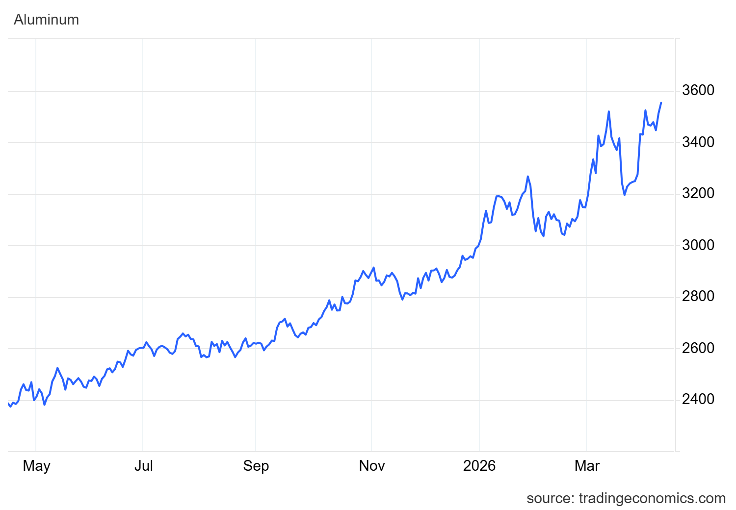 Il mercato dei metalli industriali sta vivendo una delle fasi più turbolente dalla primavera del 2022. I futures sull’alluminio al London Metal Exchange (LME) hanno sfondato quota 3.560 dollari per tonnellata in questo aprile 2026. Ecco il grafico da Tradingeconomics