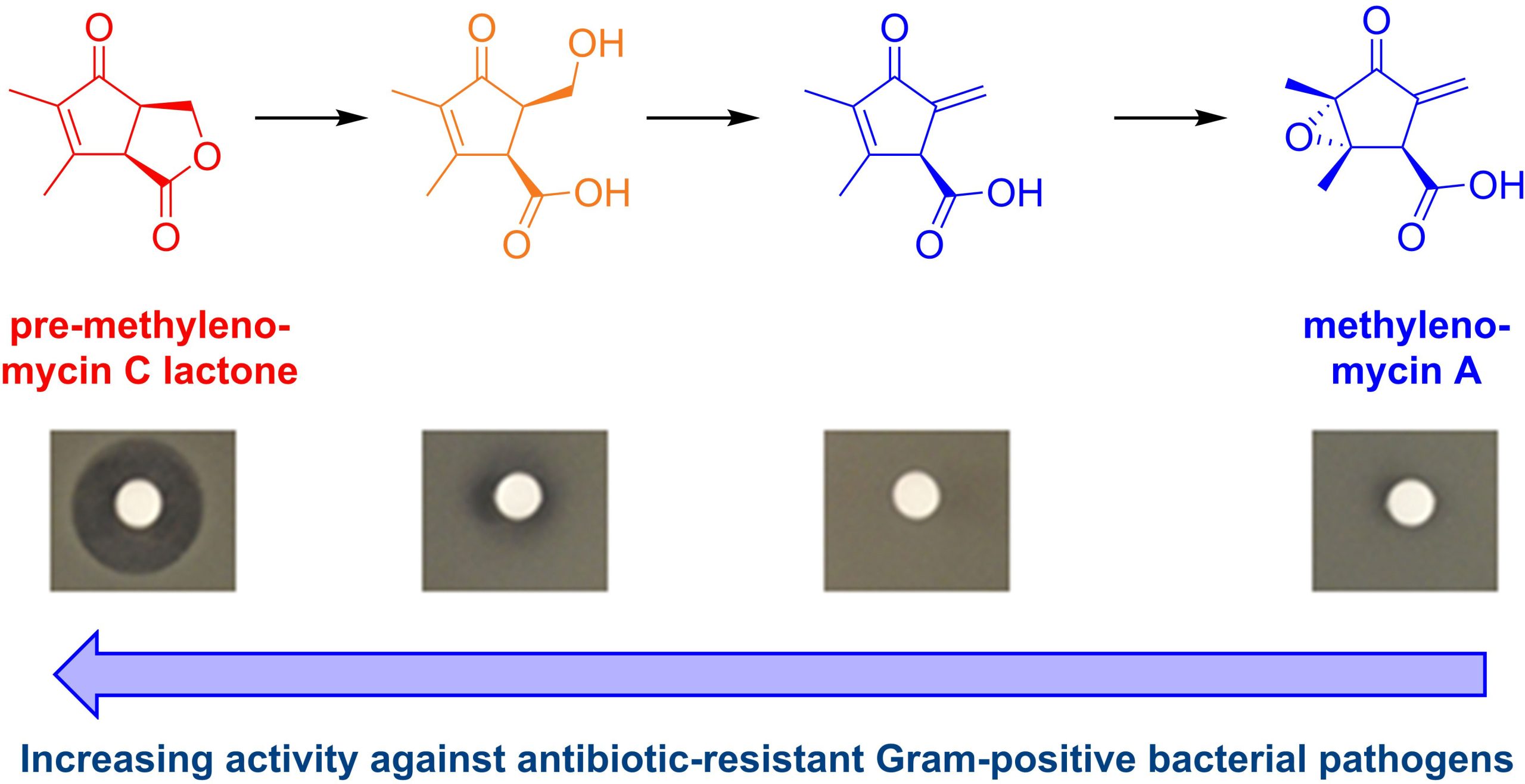 L’analisi di uno di questi intermedi, il pre-metilenomicina C lattone, ha dato risultati sbalorditivi. Il composto ha mostrato un’attività oltre 100 volte superiore rispetto alla metilenomicina A contro diversi batteri Gram-positivi.