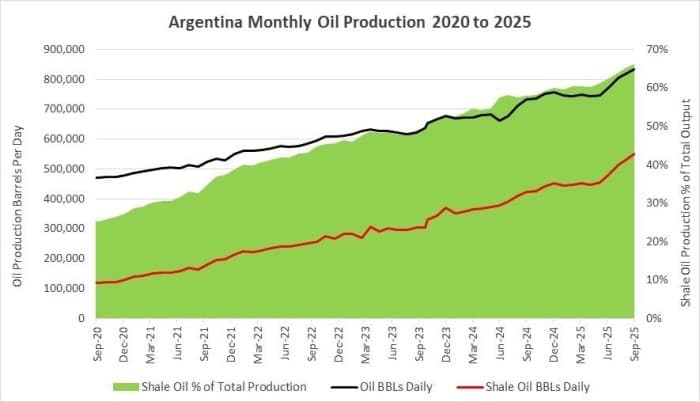 Il forte aumento della produzione di petrolio da scisti è responsabile dell’impressionante incremento della produzione petrolifera argentina, mentre la produzione di petrolio convenzionale è rimasta ancora una volta stabile. Nel mese di settembre 2025, la produzione di petrolio non convenzionale dell’Argentina è aumentata di un incredibile 30% su base annua, raggiungendo una media di 550.881 barili al giorno, un nuovo record assoluto. Di conseguenza, il petrolio da scisti rappresenta il 66% della produzione totale di petrolio dell’Argentina, il livello più alto mai registrato.
