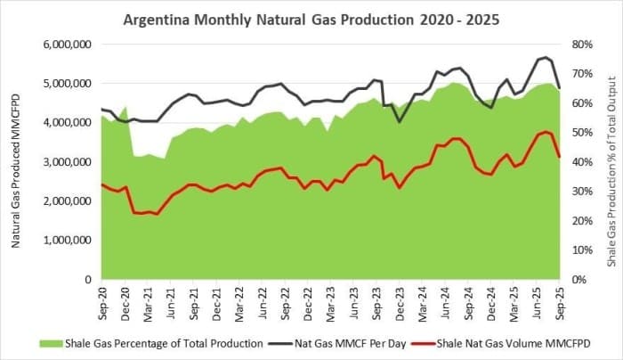 Una nota deludente è il crollo della produzione di gas naturale dell’Argentina nel settembre 2025. I dati del Ministero dell’Economia mostrano che il Paese ha estratto 4,9 miliardi di piedi cubi di gas naturale nel mese, il 6% in meno rispetto al mese precedente e il 12% in meno rispetto all’anno precedente. Ciò è dovuto principalmente al forte calo della produzione di gas di scisto, che nel mese di settembre 2025 è stata pari a 3,1 miliardi di piedi cubi al giorno, con una diminuzione del 7,5% rispetto al mese precedente e del 15,6% rispetto allo stesso periodo dell’anno precedente.