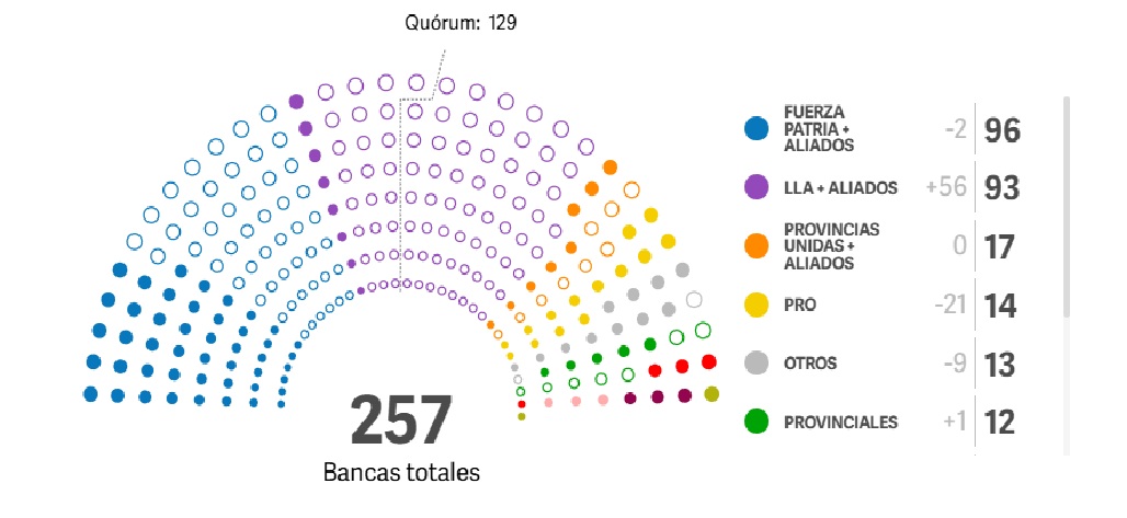 Alla Camera dei Deputati, LLA diventerà la minoranza più numerosa, superando l’Unión por la Patria. Il blocco libertario balza dagli attuali 37 deputati a 93, ai quali si sommano almeno 20 alleati del PRO che si sono uniti alle liste viola. Questo porta il totale della coalizione di governo a circa 110-113 seggi.