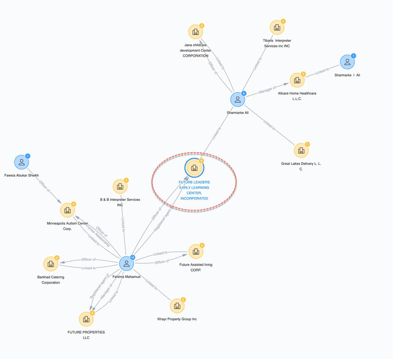 Non si tratta solo di asili. L’inchiesta suggerisce un sistema ben oliato di “società di facciata”. Analizzando i registri, emergono nomi ricorrenti. Ad esempio, Fahima Mahamud risulta funzionario del Future Leaders ma anche di altre società legate all’assistenza agli autistici e alla vita assistita. Un altro nome, Sharmarke Ali, collega il centro per l’infanzia a società di assistenza domiciliare. Un complesso sistema che controlla tutte queste istituzioni finalizzate solo a raccaltare fondi pubblici.