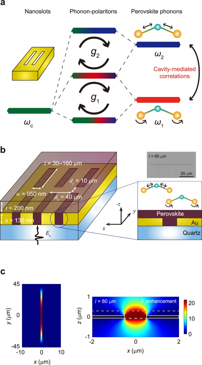 a Ibridazione tra una modalità nanoslot-cavità, con frequenza ωc, e due modalità fononiche ottiche trasversali nei materiali perovskiti, con frequenze ω1 e ω2, nel regime di frequenza cavità bassa e detunata, ωc ≪ ωλ (λ = 1, 2). Le intensità di accoppiamento di queste modalità fononiche sono indicate rispettivamente con g1 e g2. Le correlazioni anomale tra i fononi sono mediate dalla modalità cavità e governate dai rapporti di accoppiamento gλ/ωλ. b Illustrazione del sistema ibrido perovskite-nanoslot illuminato da luce terahertz. Sono stati realizzati sette nanoslot di diverse lunghezze (l = 30-160 μm) per sintonizzare la frequenza di risonanza della cavità. L’inserto mostra un’immagine al microscopio elettronico a scansione che mostra una nanoslot nuda (vista dall’alto); barra di scala: 20 μm. c, Simulazione numerica (COMSOL) che mostra un aumento della componente x del campo elettrico (Ex) alla risonanza (0,77 THz) in una nanoslot riempita con perovskite MAPbI3. Sinistra: vista dall’alto (piano z = 0); destra: sezione trasversale (piano y = 0). Le linee tratteggiate bianche delineano l’area riempita con MAPbI3. Le linee continue bianche delineano l’area della nanoslot. Da Nature Communications