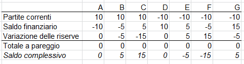 Il paese B è in surplus di partite correnti. Una parte della valuta che entra viene accumulata presso la banca centrale sotto forma di riserve e una parte reinvestita all’estero (-5 e -5). Il saldo complessivo della bilancia dei pagamenti è -(-5)=5, il che indica che le riserve ufficiali aumentano di 5.