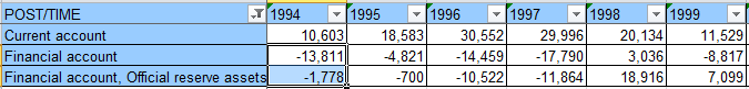 Ora entro nel merito della relazione fra saldo delle partite correnti, conto finanziario e variazione delle riserve. Guardiamo ad esempio come andavano le cose negli anni ’90: