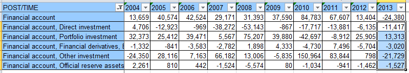 Potrete verificare che il saldo del conto finanziario è la somma algebrica dei suoi sottosaldi, e notate l’ovvio fatto che se il saldo complessivo (nel 2004: 13,659) è positivo, questo non è necessariamente un buon segno, perché significa che il resto del mondo ci sta prestando soldi (soldino entrare, segno più), il che da un lato è positivo (vuol dire che si fidano di noi), ma dall’altro è negativo (vuol dire che prima o poi dovremo ridarglieli).