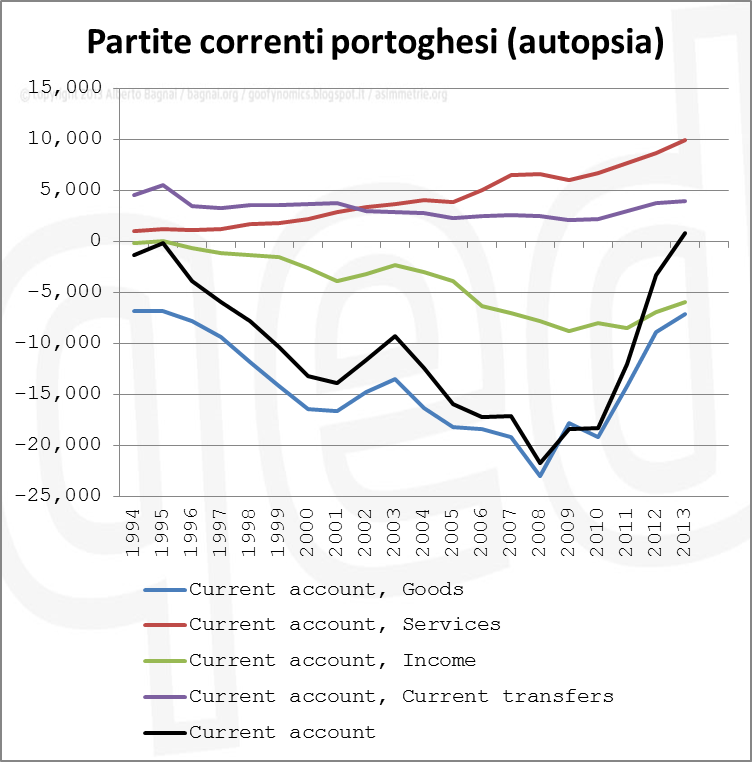 Il saldo servizi comprende voci non trascurabili, come ad esempio il turismo. Se vado all’estero e pago un albergo, quello è turismo passivo: in pratica, un italiano “importa” il servizio dell’albergo estero e lo paga, facendo uscire soldi dal paese. Ovviamente se il turista estero viene in Italia (e non si capisce perché dovrebbe farlo, visto che con l’euro sopravvalutato gli conviene andare altrove), quando paga l’albergo quello per il nostro paese è turismo attivo: stiamo “esportando” al turista estero il servizio di alloggio, e entrano soldi. Altri servizi rilevanti sono quelli di trasporto (noli marittimi), quelli finanziari (commissioni su operazioni di investimento finanziario cross border), ecc.