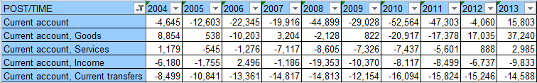 Un primo esempio: qua sotto vi riporto i quattro saldi principali della bilancia dei pagamenti italiana dal 2004 al 2013, insieme con la loro somma algebrica, che, come vedete, non è esattamente zero (ma quasi) solo a causa di errori di arrotondamento delle singole poste: