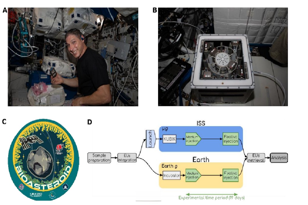 Fig. 1. L’esperimento BioAsteroid. (A) L’astronauta della NASA Michael Scott Hopkins inserisce i contenitori dell’esperimento nel KUBIK (crediti: ESA/NASA); (B) Le sei unità hardware inserite nel KUBIK a bordo della ISS (crediti ESA/NASA); (C) Logo BioAsteroid, creato da Sean McMahon (Università di Edimburgo); (D) Diagramma di flusso dell’esperimento. Dopo la preparazione, i campioni sono stati integrati nelle unità sperimentali (EU) insieme al mezzo e al fissativo. Le EU sono state lanciate sulla ISS (ovale blu), dove sono state installate negli incubatori KUBIK e sottoposte a microgravità (µg), oppure conservate per l’incubazione sulla Terra per il controllo della gravità terrestre (g terrestre, ovale giallo). Le fasi in verde facevano parte del periodo sperimentale (19 giorni). I passaggi di conservazione sono stati omessi. Da Nature