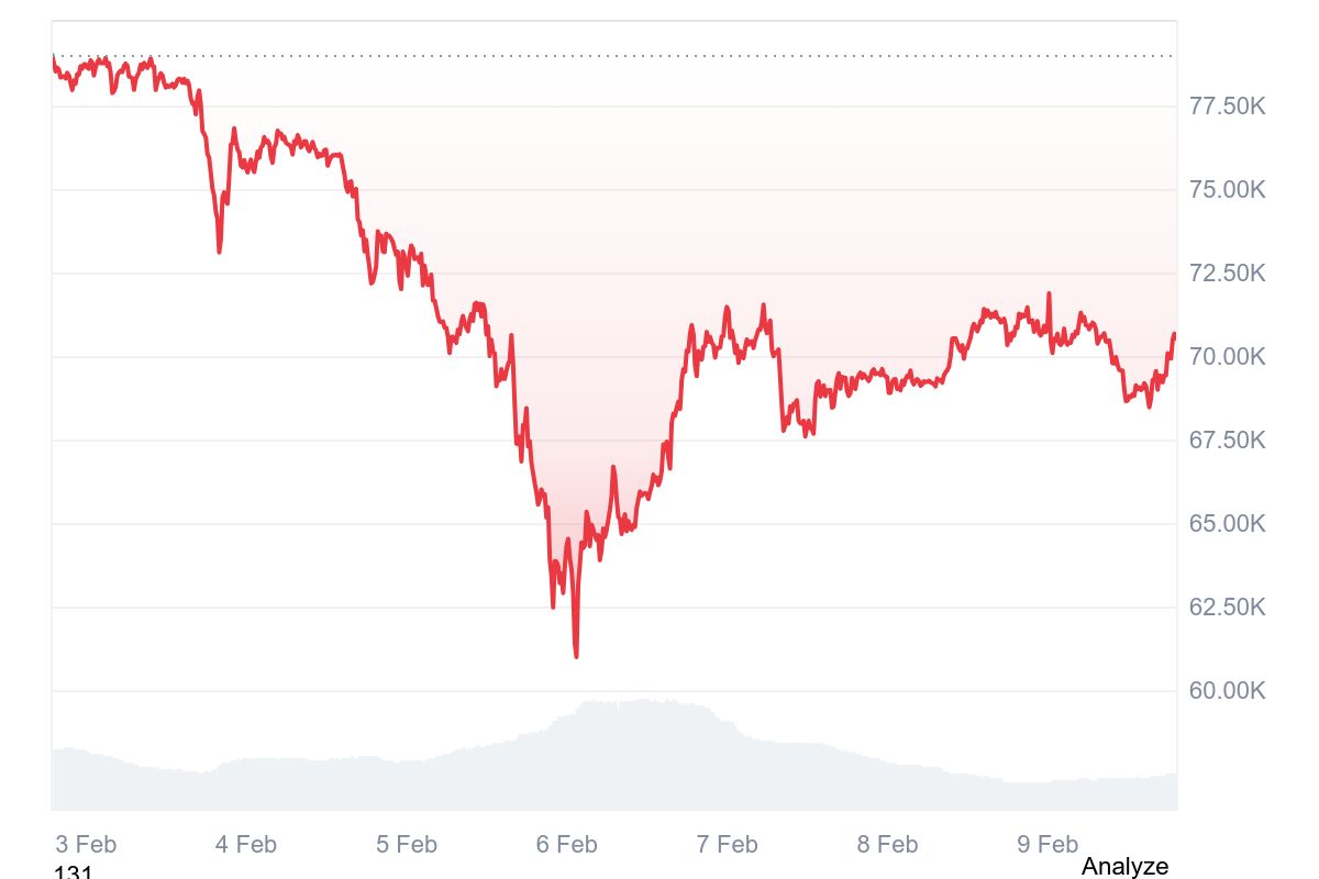 Bitcoin, da sempre il canarino nella miniera degli asset di rischio, ha subito un repricing violento, perdendo oltre il 50% dai massimi di ottobre 2025 e scendendo a trattare nella fascia 60.000-70.000 dollari, con un minimo a 60 mila e massimo che si aggirano sui 70 mila. Un token che 6 masi fa valeva 120 mila, con un dimezzamento di valore: