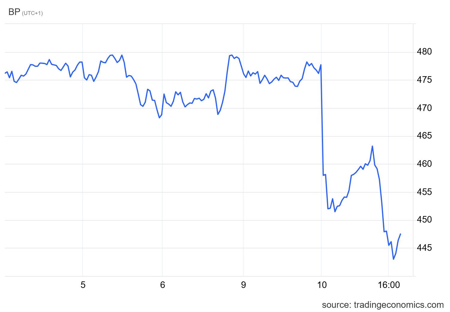 “Siamo in azione e possiamo e faremo di meglio per i nostri azionisti”, ha affermato il CEO, ma il mercato l’ha presa diversamente, le quotazioni dei titoli BP sono crollate, come mostra il seguente grafico da Tradingeconomics:
