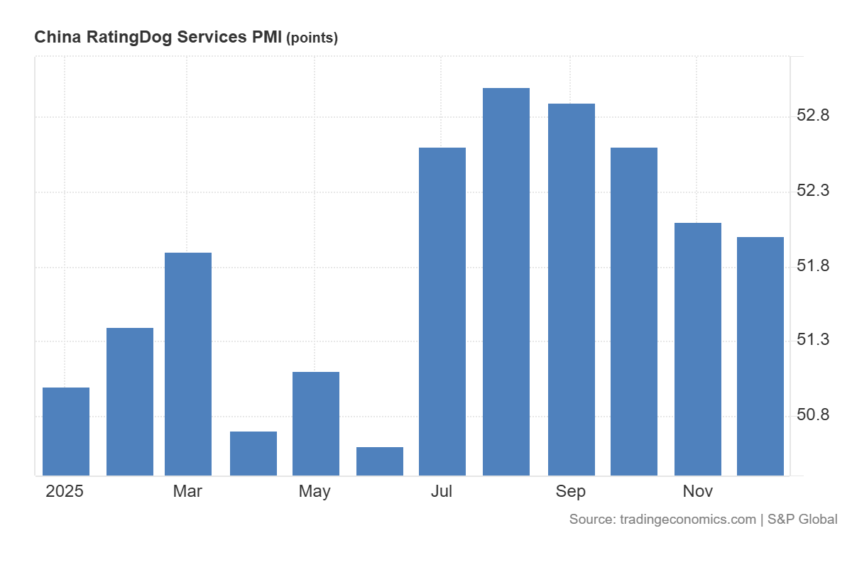 I dati macroeconomici che arrivano dall’Estremo Oriente continuano a raccontarci una storia molto diversa dalle narrative entusiastiche di certa stampa finanziaria. L’ultimo indice PMI dei servizi cinesi, targato RatingDog, si è attestato a 52,0 punti a dicembre 2025, in lievissimo calo rispetto al 52,1 di novembre. Ricordiamo che si tratta di indici previsionali settoriali, indicatori “soft”. Ecco il relativo grafico: