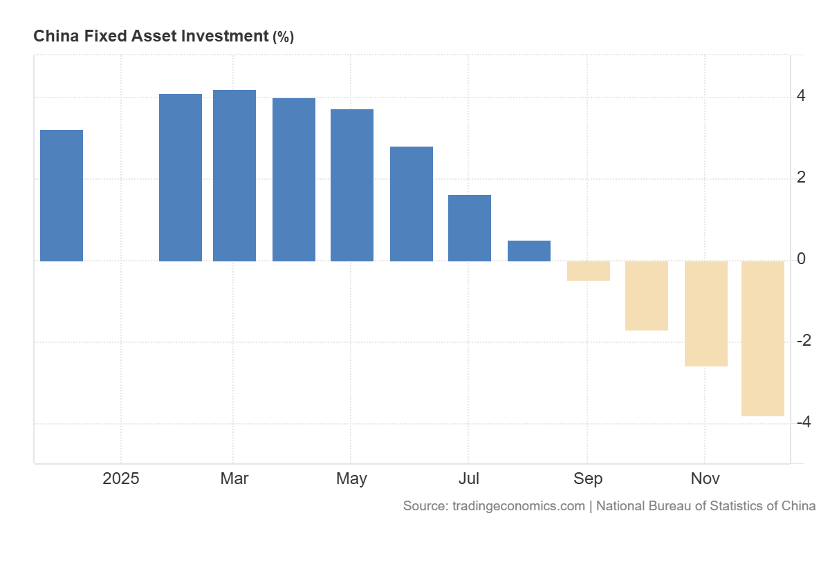 Assolutamente no, anzi, i dati indicano che la correzione è ancora in pieno svolgimento. Gli investimenti immobiliari sono crollati del 17,2% nel 2025, proseguendo un trend negativo pluriennale. Questo calo pesa enormemente sulla crescita complessiva, poiché l’immobiliare rappresentava storicamente una quota rilevante del PIL cinese. Il crollo dei prezzi delle case sta inoltre deprimendo la fiducia dei consumatori, creando un effetto ricchezza negativo che frena le vendite al dettaglio e alimenta le pressioni deflazionistiche.