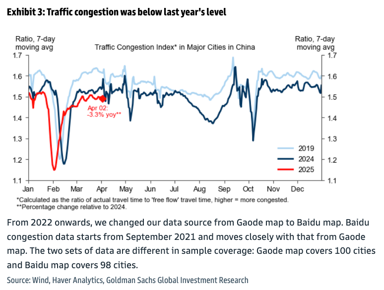 Gli ultimi indicatori ad alta frequenza di Goldman – che coprono i consumi, la mobilità, la produzione, gli investimenti e la più ampia attività macro – sono datati al 3 aprile, in concomitanza con la “Festa della Liberazione” del Presidente Trump che ha colpito la Cina e altri partner commerciali globali.