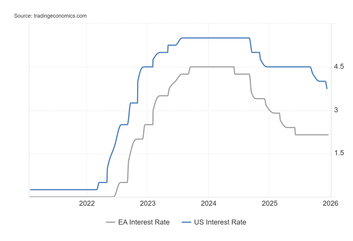 Il quadro di partenza evidenzia due percorsi distinti. Nell’area euro la Banca Centrale Europea ha riportato i tassi verso un’area di stabilità dopo il rientro dell’inflazione headline e il ridimensionamento delle pressioni energetiche. Negli Stati Uniti la Federal Reserve ha avviato una fase di riduzione più prudente, coerente con un’economia strutturalmente più dinamica e con un mercato del lavoro ancora prossimo alla piena occupazione. La divergenza non è meramente congiunturale, ma riflette differenze profonde nei modelli di crescita e nei rispettivi assetti istituzionali.