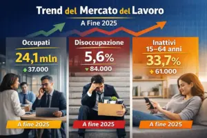 Nel Mezzogiorno, infatti, alla riduzione della disoccupazione si affianca un aumento del tasso di inattività pari a 0,8 punti percentuali, segnalando una crescita della quota di persone che non lavorano e non sono attivamente alla ricerca di un impiego né immediatamente disponibili a iniziarlo