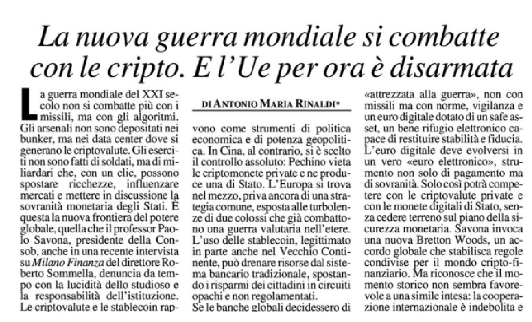 No, affatto. L’articolo di Rinaldi è negativo sulla strategia dell’Unione Europea. Rinaldi riconosce che le criptovalute, piaccia o no, sono diventate strumenti di politica economica e geopolitica. Sono le nuove “armi” della guerra finanziaria globale. Il testo evidenzia come USA e Cina le stiano usando attivamente (seppur in modi diversi) per i propri fini strategici, mentre l’Europa si è limitata a una risposta burocratica (la regolamentazione MiCA), perdendo un’occasione e rimanendo indietro.