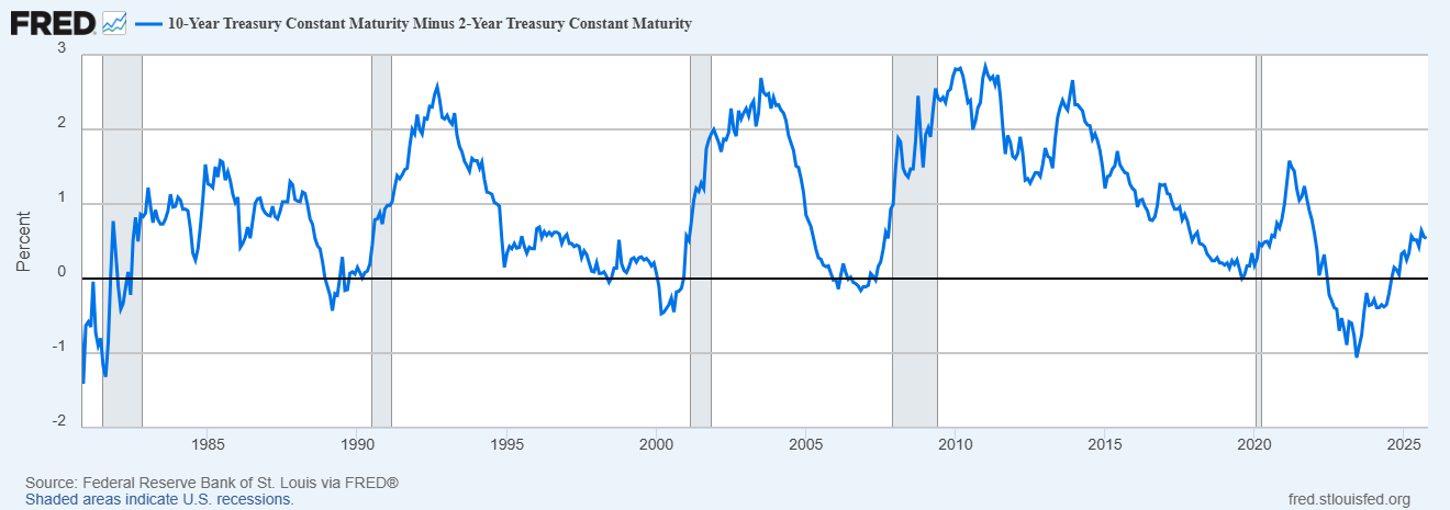 Spesso si parla di “Inversione dei tassi d’interesse“, ritenendo questo fenomeno un segnale di una recessione imminente.  Dal 2022 a metà 2024, questo segnale (con i tassi a breve termine più alti di quelli a lungo termine) ha preannunciato una recessione che, di fatto, non si è ancora vista. L’economia USA, tra alti e bassi, ha continuato a crescere.