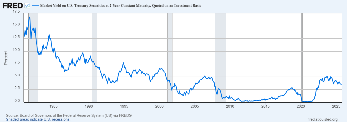 Rendimento dei titoli di stato USA a 2 anni. Fonte FED di Saint Louis