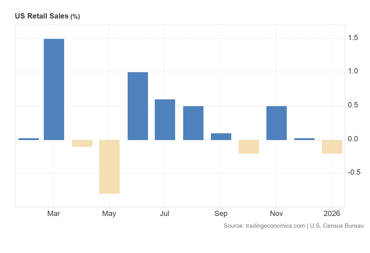 Come se non bastasse il fronte lavorativo, le vendite al dettaglio a gennaio 2026 sono scese dello 0,2% rispetto al mese precedente. È il primo calo effettivo da ottobre 2025, in linea con le aspettative del mercato, ma indicativo di un consumatore americano che, avendo esaurito i risparmi accumulati, inizia a tirare i remi in barca.
