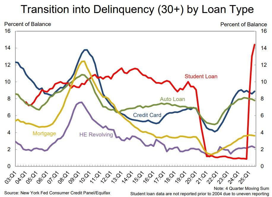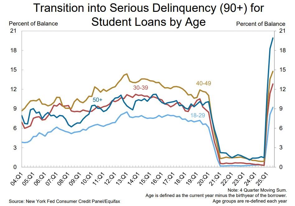 Durante la pandemia (dal 2020) e fino alla fine del 2024, il governo federale aveva sospeso i pagamenti obbligatori sui prestiti studenteschi. I mancati pagamenti non venivano segnalati alle agenzie di rating. Ora queste moratorie sono terminate. I pagamenti sono ripresi e, come previsto, milioni di persone non sono in grado di sostenerli. I dati che vediamo ora sono semplicemente la realtà che emerge dopo la fine della “pausa” artificiale, e stanno colpendo duramente anche persone mature (over 50) ancora indebitate per studi fatti decenni fa.