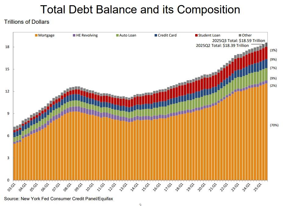 Il debito totale delle famiglie americane è aumentato di 197 miliardi di dollari (+1%) nel terzo trimestre del 2025, raggiungendo la nuova vetta stratosferica di 18.590 miliardi di dollari. Questo colossale importo è suddiviso tra 13.500 miliardi in debiti immobiliari (mutui) e 5.100 miliardi in debiti “non-housing” (tutto il resto).