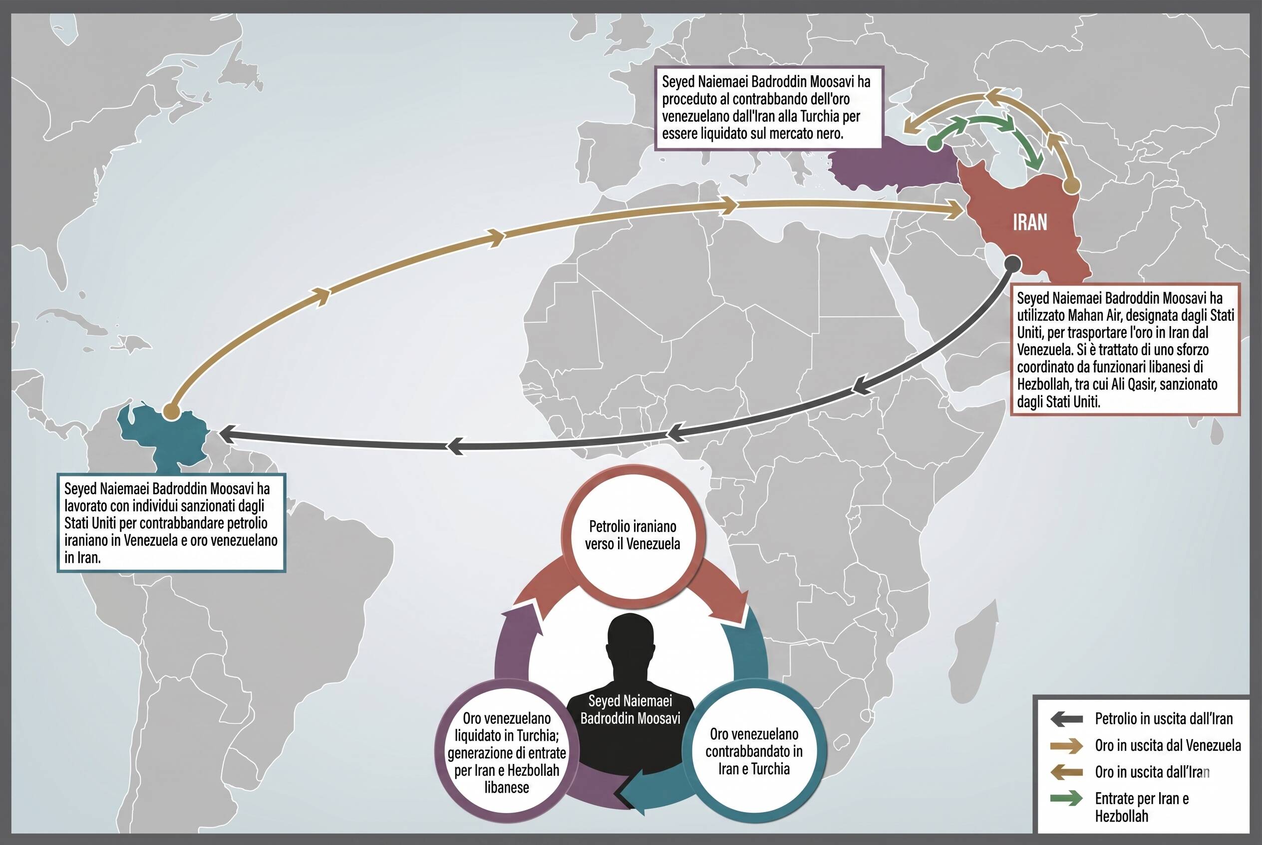 - L’asse Caracas-Teheran (Petrolio per Oro): La seconda direttrice colpisce Seyed Naiemaei Badroddin Moosavi, un finanziatore legato a Hezbollah. Il suo schema è da manuale di economia sommersa: contrabbandare petrolio iraniano verso il Venezuela (sotto l’ex regime di Maduro) in cambio di oro a prezzi scontati. L’oro veniva poi trasferito a Teheran tramite la compagnia aerea Mahan Air e infine contrabbandato in Turchia per essere liquidato sul mercato.Probabilmente il cambio di relazioni fra USA e Venezuela ha fornito informazioni essenziali.