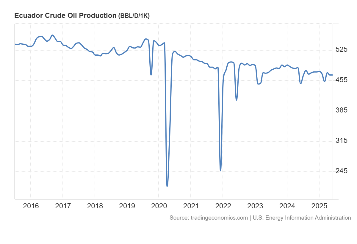 Gli ultimi dati indicano che la produzione annuale di petrolio dell’Ecuador nel 2025 sarà la più bassa degli ultimi dieci anni. Infatti, secondo stime recenti, la produzione di petrolio si attesta a circa 465.369 barili al giorno, un dato significativamente inferiore ai 556.554 barili al giorno estratti nel 2014, quando la produzione petrolifera del Paese andino ha raggiunto il picco. Un calo così netto, senza una strategia chiara per espandere la produzione in modo sostenibile, sottolinea la situazione critica in cui versa il settore degli idrocarburi, fondamentale per l’economia dell’Ecuador.