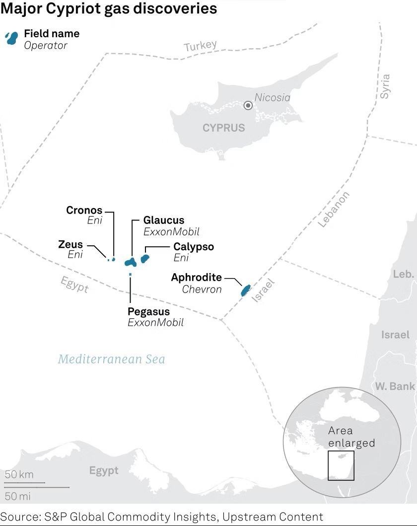 | Blocco Aphrodite | Chevron, Shell, NewMed Energy | Giacimento Aphrodite (4.6 Tcf) |