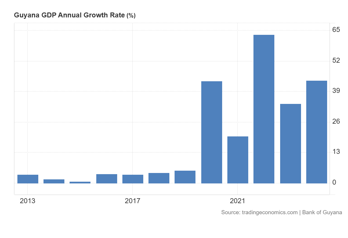Il blocco Stabroek è un giacimento petrolifero di livello mondiale che contiene almeno 11 miliardi di barili di petrolio recuperabile di alta qualità. Exxon sta traendo profitto dall’accordo di condivisione della produzione (PSA) stipulato con Georgetown, che prevede un tasso di royalty estremamente basso, pari al 2%. Questo, insieme al basso prezzo di pareggio del blocco Stabroek, al petrolio greggio leggero di alta qualità e alla produzione in crescita, aumenterà in modo significativo i profitti di Exxon. Anche l‘economia della Guyana ne sta beneficiando, con una crescita a doppia cifra del prodotto interno lordo (PIL) a partire dal 2021, che rende il paese il più ricco del Sud America in termini di PIL pro capite.