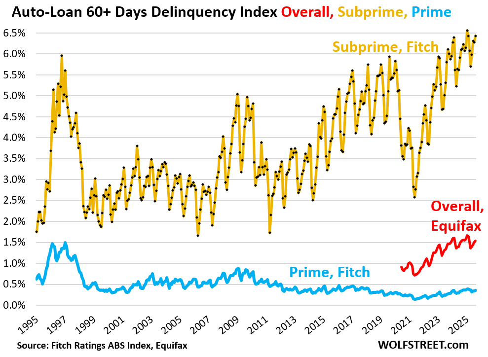 Se guardiamo ai numeri reali, e non ai titoli sensazionalistici, scopriamo che i consumatori e i loro prestiti auto se la cavano discretamente. Il grafico allegato, che combina dati di Fitch e Equifax ed è stato elaborato, con abilità, da Wlfstreet, è illuminante e mostra una netta spaccatura del mercato.