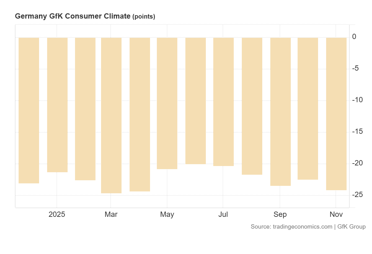 Il clima dei consumatori tedeschi, misurato dal GfK Consumer Climate powered calcolato dal NIM, continua la sua discesa. L’indicatore per novembre 2025 prevede un calo di 1,6 punti, attestandosi a -24,1 punti.
