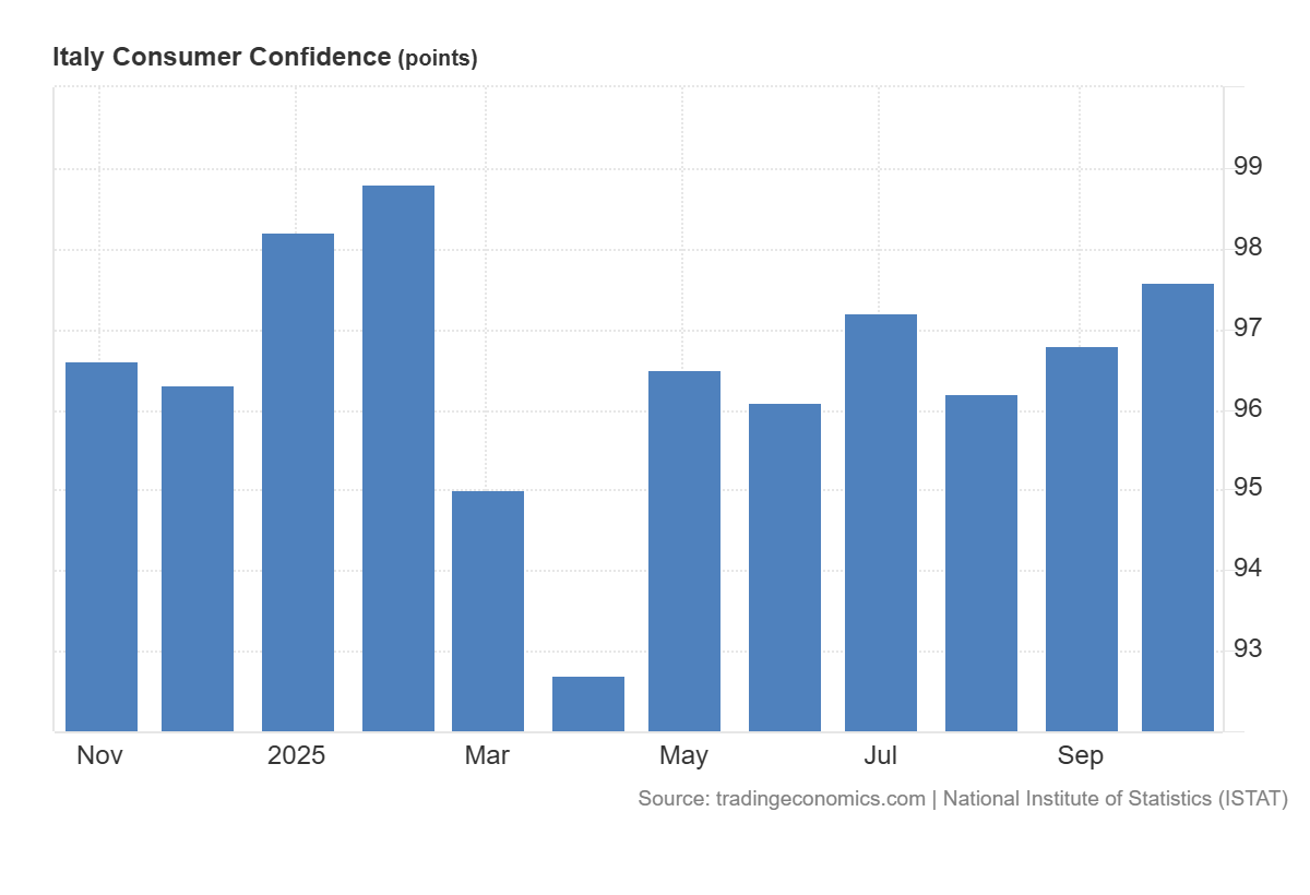 L‘indice italiano è salito a 97,6 punti a ottobre 2025 (da 96,8 del mese precedente), segnando il livello più alto da febbraio. È il secondo mese consecutivo di miglioramento.