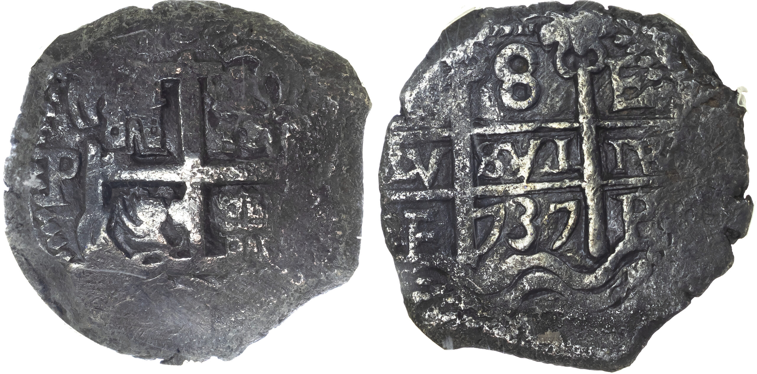 • Cosa: Oltre 1.000 monete d’argento (Reales) e 5 monete d’oro (Escudos). Le monete, coniate nelle colonie spagnole, sono in un ottimo stato di conservazione, suggerendo che provenissero da un unico forziere.