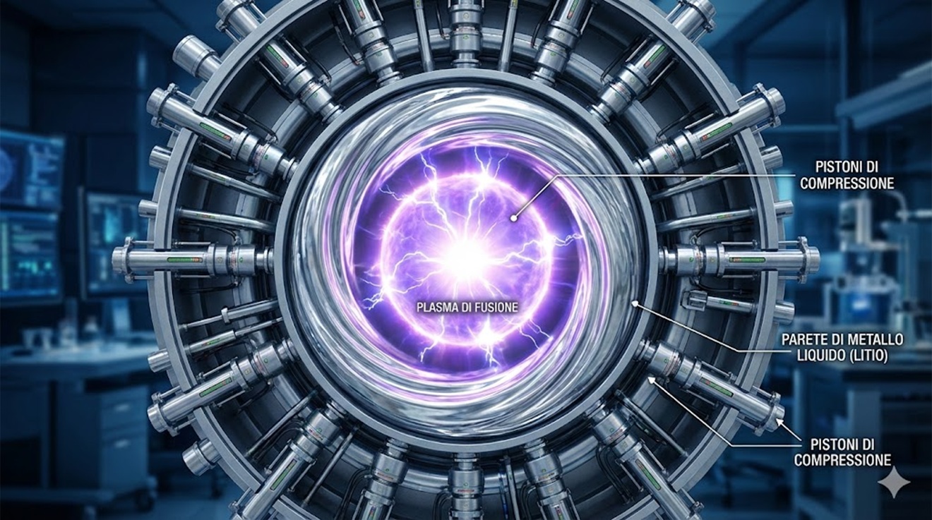 - Iniezione del Plasma: Un iniettore spara un anello di plasma magnetizzato (idrogeno isotopico) all’interno di una camera rivestita di metallo liquido rotante.