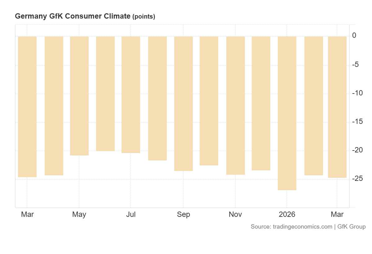 Il clima di fiducia dei consumatori in Germania è destinato a subire un inaspettato e ulteriore peggioramento nel mese di marzo. Le famiglie tedesche mostrano infatti una propensione alla spesa significativamente ridotta, frenate dalle persistenti tensioni geopolitiche e dalle crescenti preoccupazioni per le politiche sociali del governo. Gli indici previsionali non sono positivi.