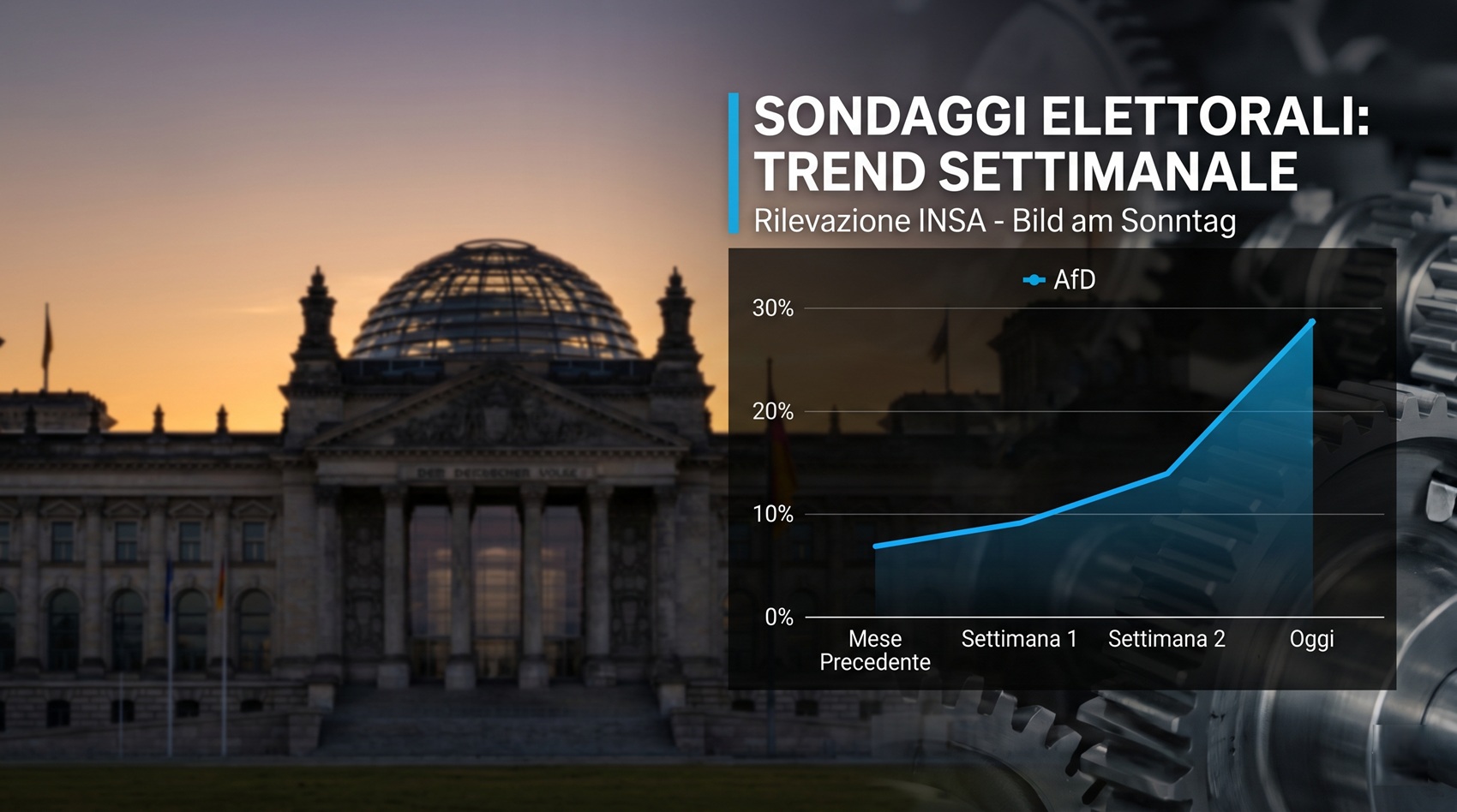 L’onda anomala non sembra volersi arrestare e la locomotiva d’Europa si scopre sempre più smarrita dal punto di vista politico. Secondo l’ultimo “Sunday Trend”, il sondaggio settimanale condotto dall’istituto di ricerca Insa per la Bild am Sonntag, l’Alternative für Deutschland (AfD) ha raggiunto un nuovo picco storico attestandosi al 28% delle preferenze. Un balzo in avanti che permette al partito di ampliare nettamente il proprio vantaggio sull’Unione conservatrice (CDU/CSU), che rimane ancorata al 24%.