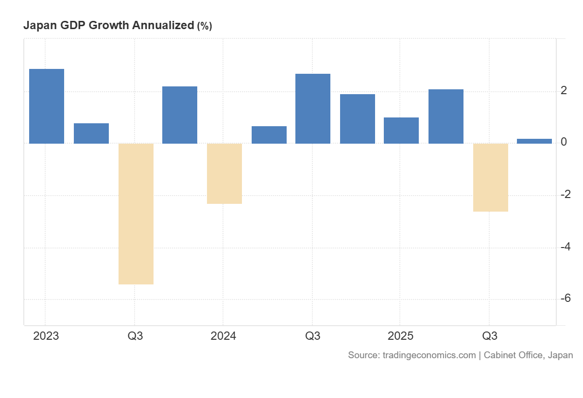 I dati preliminari sul Prodotto Interno Lordo giapponese per il quarto trimestre del 2025 non lasciano spazio a facili entusiasmi. L’economia del Sol Levante è cresciuta a un modesto ritmo annualizzato dello 0,2%, un dato che inverte la pesante contrazione del 2,6% registrata nel trimestre precedente, ma che delude ampiamente le aspettative del mercato, ferme a un ben più rosee previsioni dell’1,6%. Ecco il relativo grafico da Tradingeconomics: