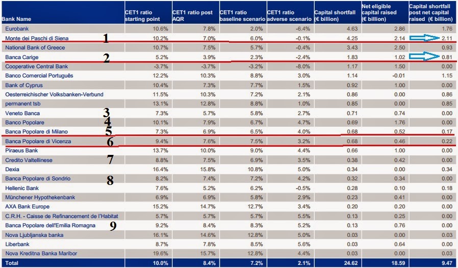 La gravità della situazione è più chiara se si guardano le carenze di capitale in relazione alla grandezza di ciascuna economia. La Francia ne esce a pezzi con oltre il 10% di carenze in rapporto al PIL, seguono Olanda, Belgio, Italia e Germania. Paradossalmente i piccoli paesi che hanno maggiormente subito negli anni precedenti gli effetti della crisi finanziaria presentano percentuali di sottocapitalizzazione più maneggevoli. Il che non significa che siano lidi sicuri, ma solo che hanno già pagato (e salato) parte del conto, a differenza di quanti sono stati sinora graziati o quasi.