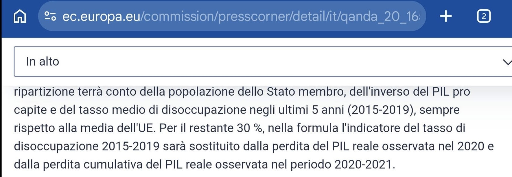 La quota teoricamente spettante a ciascun Paese membro era infatti calcolata sulla base di parametri oggettivi: popolazione, PIL pro capite relativo, condizioni del mercato del lavoro e, nella fase successiva, impatto economico della pandemia, misurato attraverso la caduta del PIL nel 2020 e nel biennio seguente. In sostanza, il peso della quota italiana non fu scritto dal carisma del premier di turno, ma da una formula tecnica già codificata nei regolamenti europei. Per chi volesse trovare i riscontri a questi dati alleghiamo il .pdf completo della norma recovery-and-resilience-facility-fax-ita.