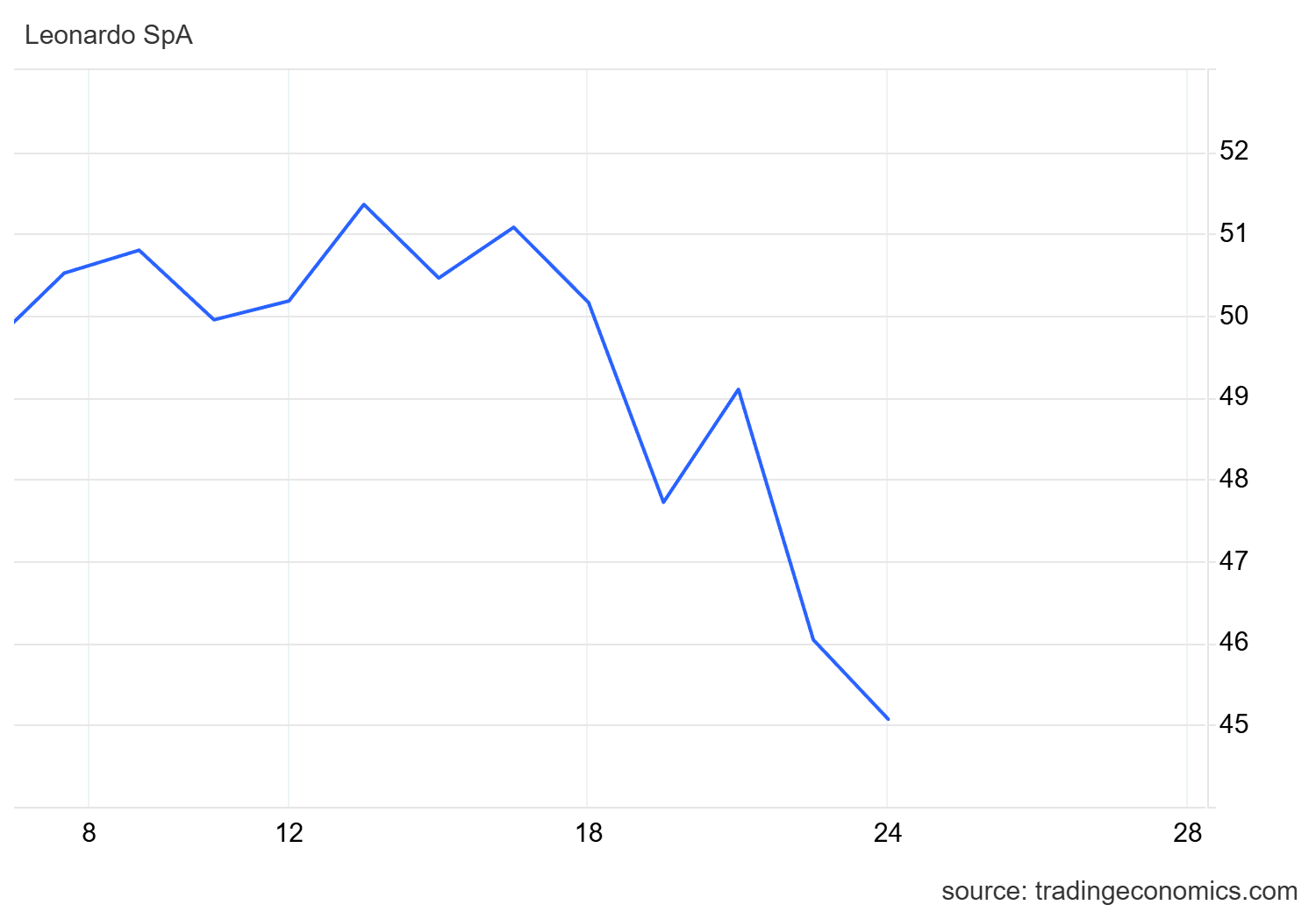 Anche la nostra Leonardo non è immune. Dopo aver toccato quota 51 euro, il titolo ha inserito la retromarcia scivolando verso i 45 euro. Se il mercato credesse in una guerra lunga anni, questi titoli sarebbero sui massimi. Il fatto che scendano significa che si prezza un “Cessate il fuoco” o comunque un congelamento delle ostilità.
