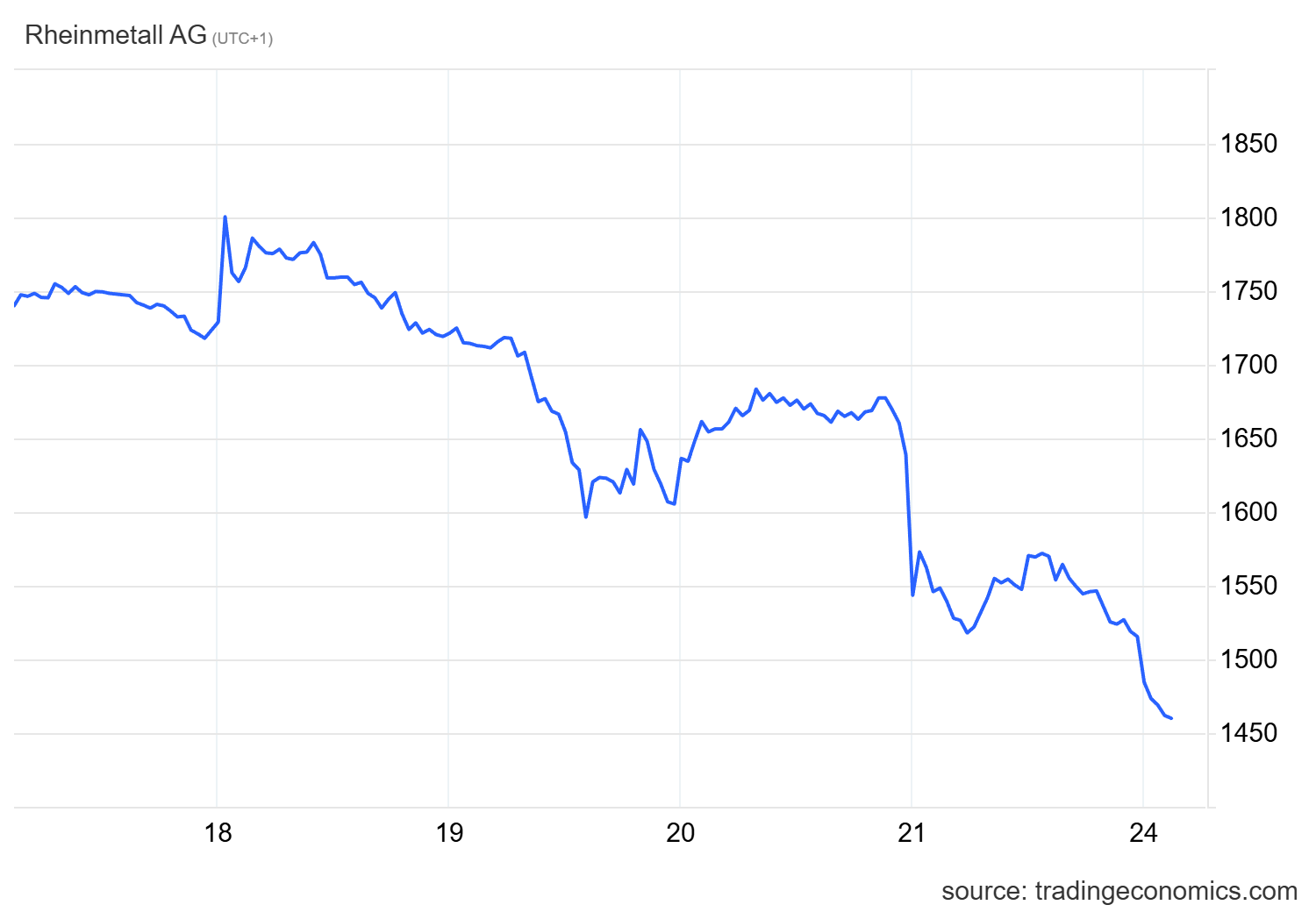 Prendiamo Rheinmetall, il colosso tedesco degli armamenti. Il grafico parla da solo: una discesa ripida, quasi verticale, dai massimi in area 1.800 giù fino a sotto 1.450. Un movimento che segnala che il mercato non crede più in una crescita esponenziale degli ordini di munizioni e carri armati nel breve termine, nonostante tutte le promesse del governo Merz: