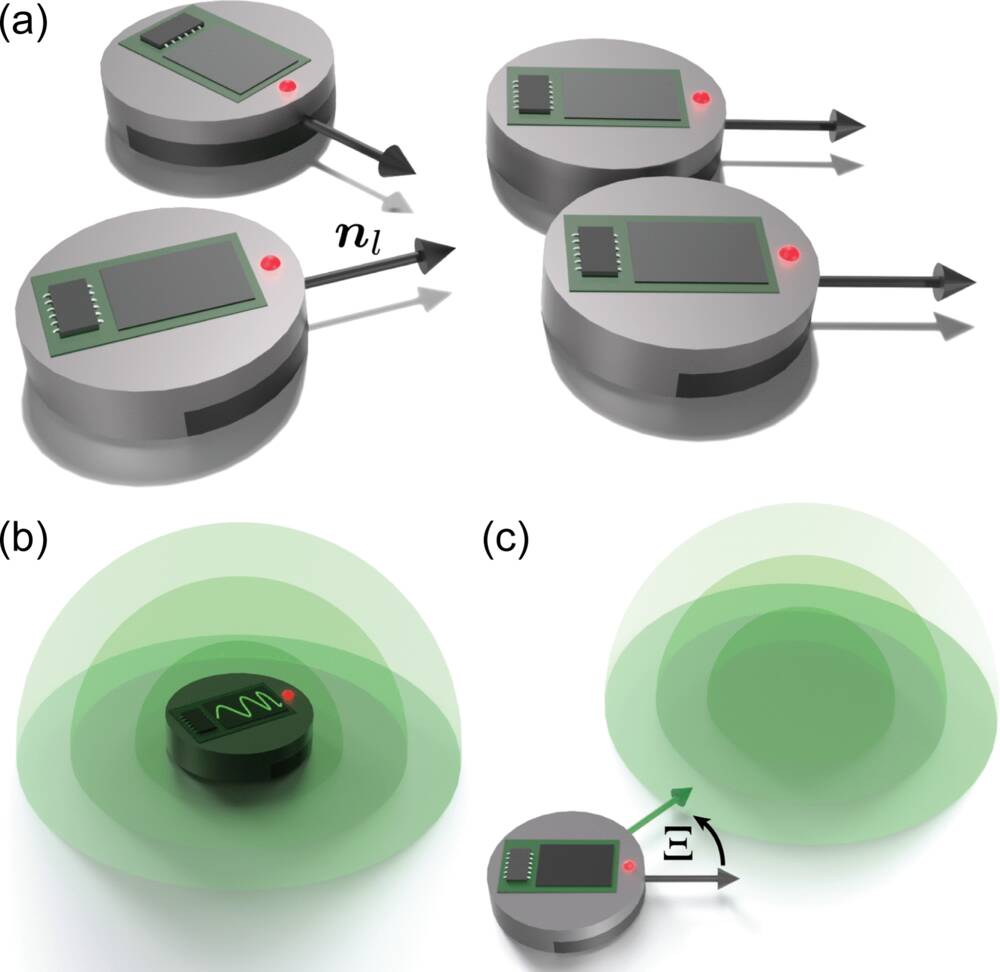 Materia attiva che comunica acusticamente. (a) Schema di sciami autopropulsi con allineamento polare. Le frecce indicano la direzione di movimento degli sciami, 𝒏𝑙. (b) I singoli sciami possiedono un oscillatore interno che controlla le loro emissioni acustiche. A loro volta, i loro stati oscillatori possono sincronizzarsi tramite il campo acustico. (c) Gli sciami si allineano verso ampiezze sonore più elevate con suscettibilità acustica. Da Physical review X