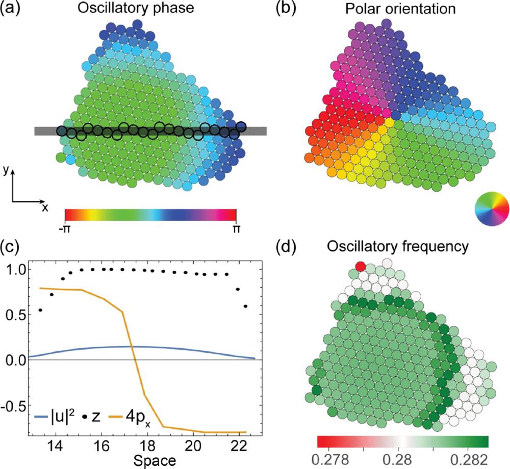 Materia attiva che comunica acusticamente. (a) Schema di sciami autopropulsi con allineamento polare. Le frecce indicano la direzione di movimento degli sciami, 𝒏𝑙. (b) I singoli sciami possiedono un oscillatore interno che controlla le loro emissioni acustiche. A loro volta, i loro stati oscillatori possono sincronizzarsi tramite il campo acustico. (c) Gli sciami si allineano verso ampiezze sonore più elevate con suscettibilità acustica. Da Physical review X