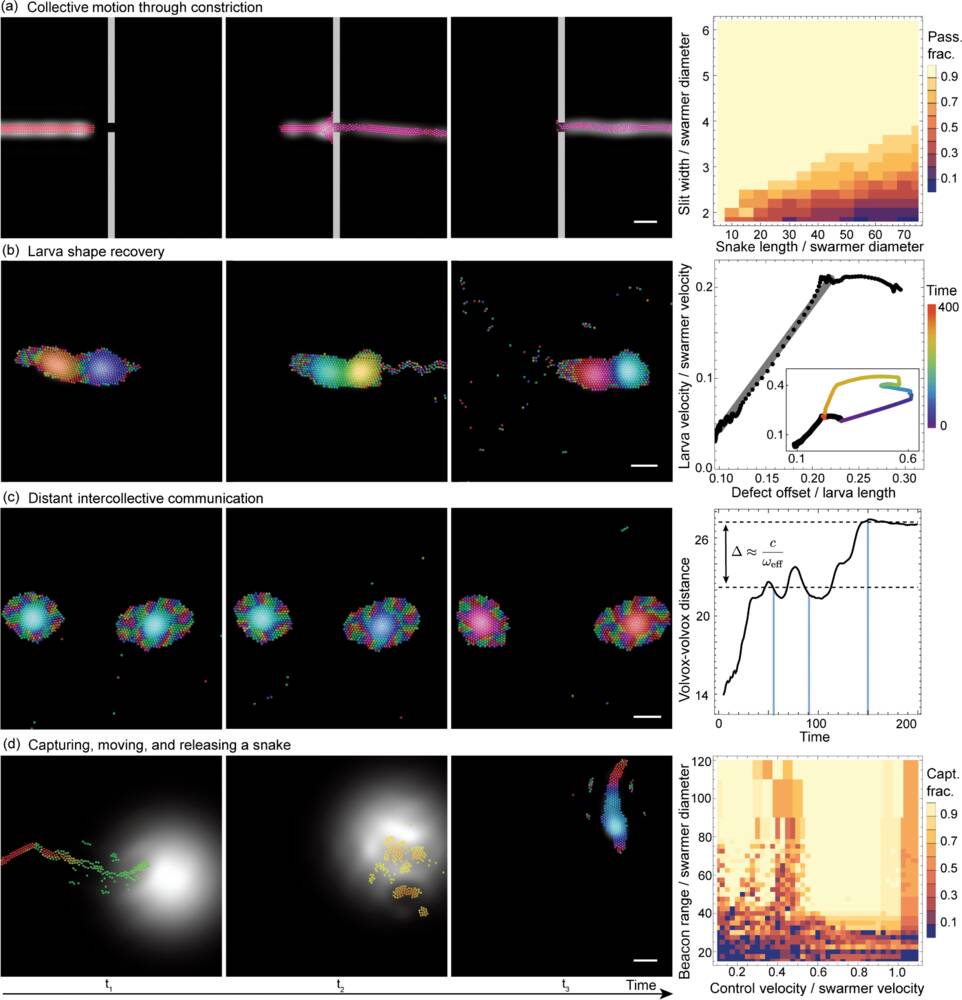 - Resilienza e Auto-Riparazione: Queste non sono fragili macchine. Uno sciame a “serpente” può attraversare una stretta fessura, deformandosi e riassemblandosi dall’altra parte. Una “larva” a cui viene “tagliata” la testa (la zona dove viene generato il ritmo del movimento) è in grado di rigenerarla, ripristinando la sua piena funzionalità. Questa capacità di auto-guarigione è una caratteristica tipica dei sistemi viventi.