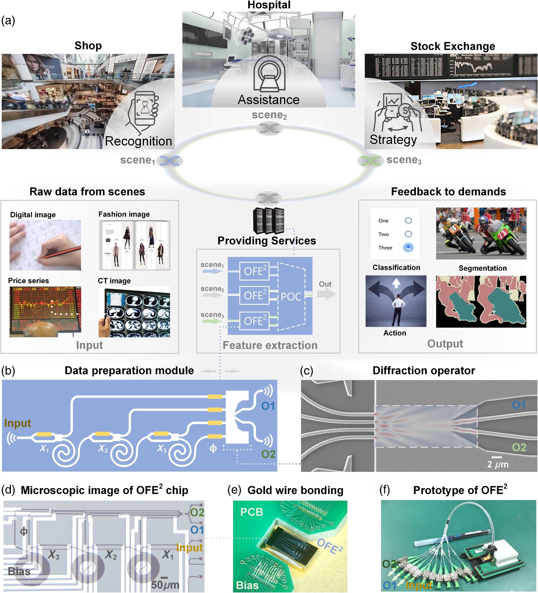 OFE2 potenzia l’estrazione di caratteristiche ad alta velocità. (a) Gli OFE2 facilitano l’allocazione flessibile per soddisfare le esigenze multitasking introdotte da scene diverse, consentendo funzioni quali l’estrazione di caratteristiche, la generazione di azioni e il riconoscimento di categorie. POC, accoppiatore ottico programmabile. (b) Schema dell’OFE2 integrato. X1∼3, splitter di potenza sintonizzabile; Φ, array di regolazione di fase; O1 e O2, porte di uscita dell’OFE2. (c) Immagine al microscopio elettronico dell’operatore di diffrazione e della sua distribuzione del campo ottico. (d) Immagine al microscopio ottico del chip dell’OFE2, annotata con le strutture corrispondenti, tra cui X1∼3 e Φ. (e) Processo di saldatura con filo d’oro. (f) Prototipo dell’OFE2, con pin di ingresso, uscita e polarizzazione etichettati. (da Advanced Photonics Nexus)